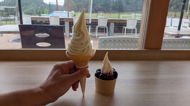 9:08 道の駅小坂田公園でミックスソフト(シャインマスカット×牛乳)とナガノパープルサンデー