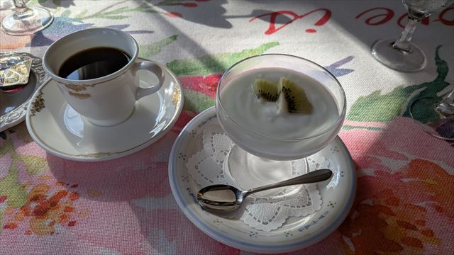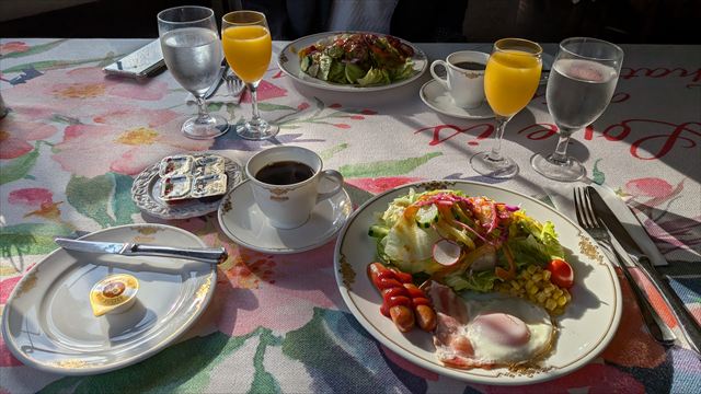 7:59 まずは野菜サラダ、目玉焼き、ソーセージ