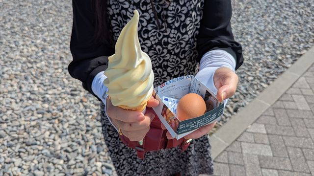 諏訪湖間欠泉センターで一休みして温泉たまごとソフトクリームを頂く。