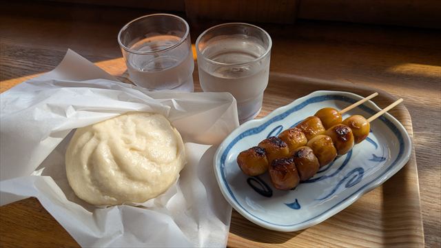 9:44 蓮如茶屋で肉まん(350円)とだんご(2本300円)を頂く