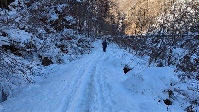 9:49 日陰は踏み固められた雪道