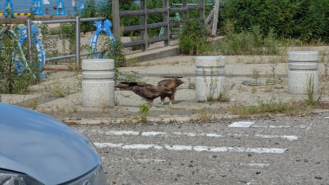 12:13 駐車場に戻るとトンビが落ちた玉子をついばんでいた