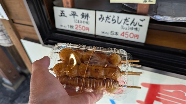 まずは道の駅細入で焼きたてのみだらしだんご(5本450円)と飛騨之牛串焼(3本1,100円)を頂く。