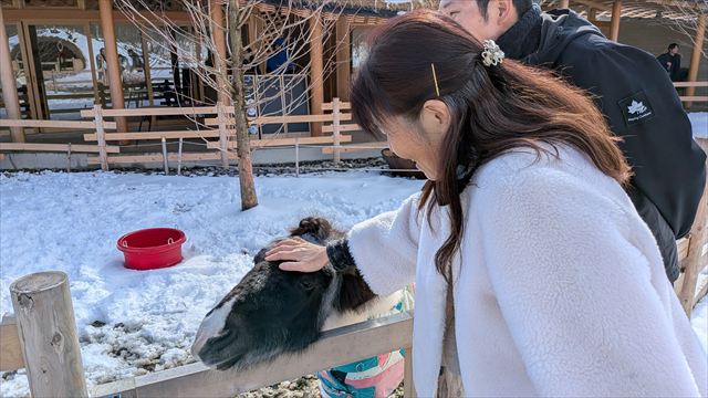 メタセコイア並木で可愛いミニチュアホースを見つけて真理子は大喜び。
